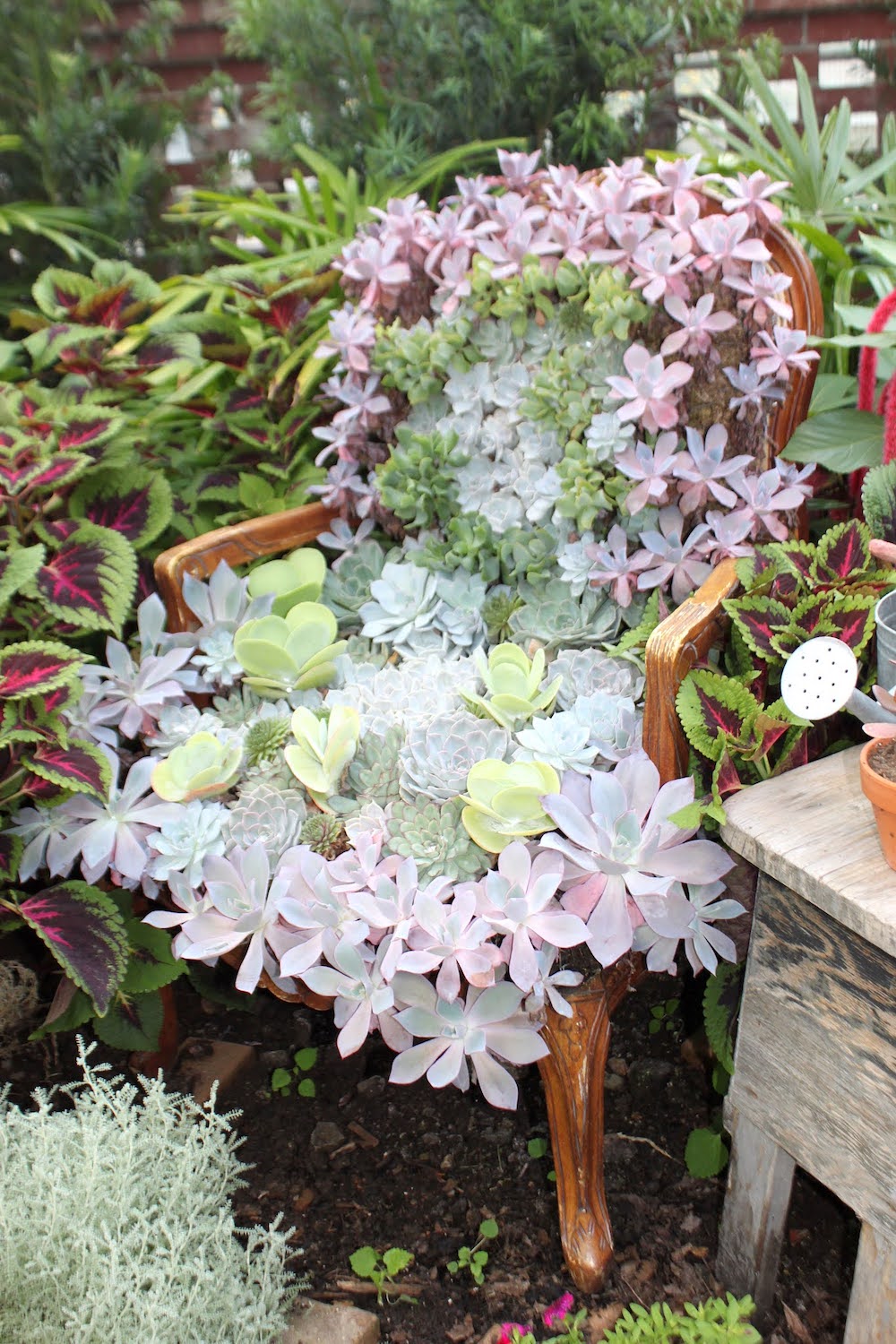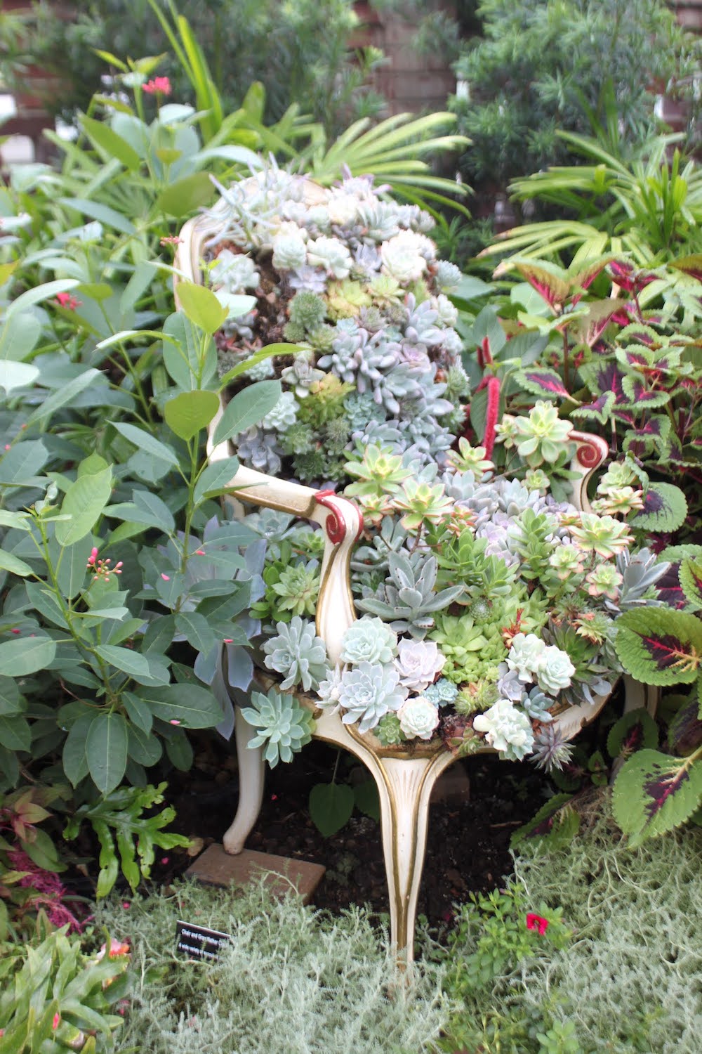 Seems having indoor furniture placed outdoors with plants growing on or in them is popular now. In this case the furniture is still indoors but it looks like it's outdoors.